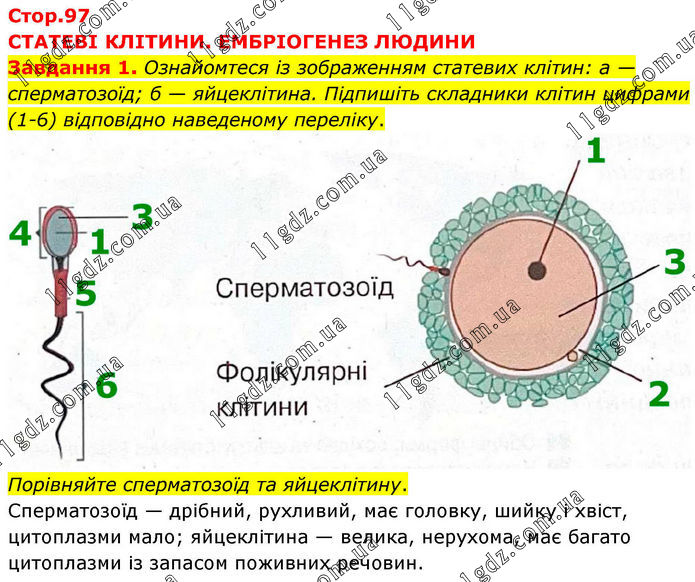 СТАТЕВІ КЛІТИНИ. ЕМБРІОГЕНЕЗ ЛЮДИНИ Завдання 1. Ознайомтеся із зображенням статевих клітин: а — сперматозоїд; б — яйцеклітина. Підпишіть складники клітин цифрами (1-6) відповідно наведеному переліку. Порівняйте сперматозоїд та яйцеклітину. Сперматозоїд — дрібний, рухливий, має головку, шийку і хвіст, цитоплазми мало; яйцеклітина — велика, нерухома, має багато цитоплазми із запасом поживних речовин.