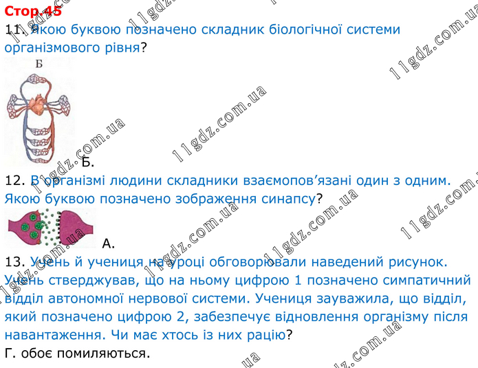 11. Якою буквою позначено складник біологічної системи організмового рівня? Б. 12. В організмі людини складники взаємопов’язані один з одним. Якою буквою позначено зображення синапсу? А. 13. Учень й учениця на уроці обговорювали наведений рисунок. Учень стверджував, що на ньому цифрою 1 позначено симпатичний відділ автономної нервової системи. Учениця зауважила, що відділ, який позначено цифрою 2, забезпечує відновлення організму після навантаження. Чи має хтось із них рацію? Г. обоє помиляються.