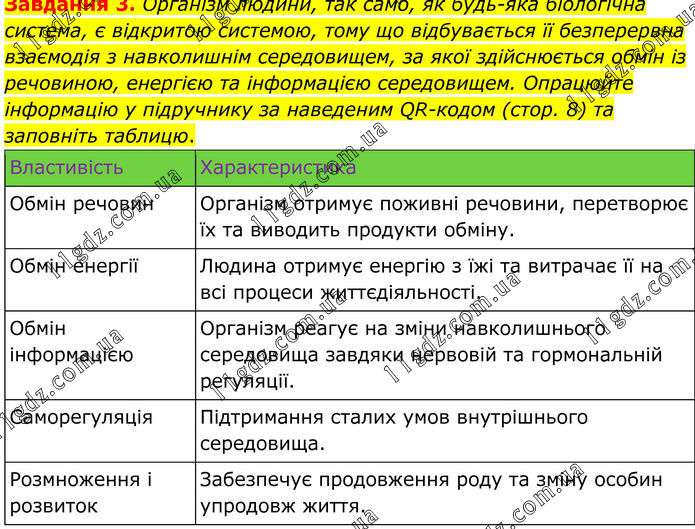 Завдання 3. Організм людини, так само, як будь-яка біологічна система, є відкритою системою, тому що відбувається її безперервна взаємодія з навколишнім середовищем, за якої здійснюється обмін із речовиною, енергією та інформацією середовищем. Опрацюйте інформацію у підручнику за наведеним QR-кодом (стор. 8) та заповніть таблицю. Властивість Характеристика Обмін речовин Організм отримує поживні речовини, перетворює їх та виводить продукти обміну. Обмін енергії Людина отримує енергію з їжі та витрачає її на всі процеси життєдіяльності. Обмін інформацією Організм реагує на зміни навколишнього середовища завдяки нервовій та гормональній регуляції. Саморегуляція Підтримання сталих умов внутрішнього середовища. Розмноження і розвиток Забезпечує продовження роду та зміну особин упродовж життя.