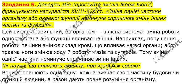 Завдання 5. Доведіть або спростуйте вислів Жорж Кюв’є, французького натураліста XVIII-XIX ст. «Зміна однієї частини організму або окремої функції неминуче спричиняє зміну інших частин та функцій». Цей вислів правильний, бо організм — цілісна система: зміна роботи одного органа або функції впливає на інші. Наприклад, порушення роботи печінки змінює склад крові, що впливає на всі органи; або травма ноги змінює ходу й роботу м’язів та суглобів. Тому зміна однієї частини неминуче спричиняє зміни інших. Як науки, що вивчають людину, пов’язані між собою? Вони доповнюють одна одну: кожна вивчає свою частину будови чи функцій людини, а разом дають повне розуміння організму.
