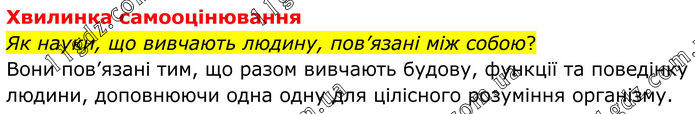 Хвилинка самооцінювання Як науки, що вивчають людину, пов’язані між собою? Вони пов’язані тим, що разом вивчають будову, функції та поведінку людини, доповнюючи одна одну для цілісного розуміння організму.