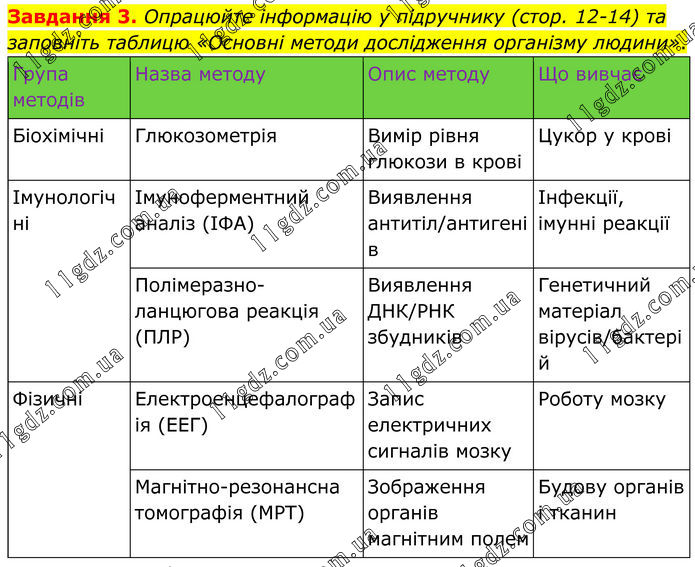 Завдання 3. Опрацюйте інформацію у підручнику (стор. 12-14) та заповніть таблицю «Основні методи дослідження організму людини». Група методів Назва методу Опис методу Що вивчає Біохімічні Глюкозометрія Вимір рівня глюкози в крові Цукор у крові Імунологічні Імуноферментний аналіз (ІФА) Виявлення антитіл/антигенів Інфекції, імунні реакції Полімеразно-ланцюгова реакція (ПЛР) Виявлення ДНК/РНК збудників Генетичний матеріал вірусів/бактерій Фізичні Електроенцефалографія (ЕЕГ) Запис електричних сигналів мозку Роботу мозку Магнітно-резонансна томографія (МРТ) Зображення органів магнітним полем Будову органів і тканин