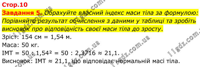 Завдання 5. Обрахуйте власний індекс маси тіла за формулою: Порівняйте результат обчислення з даними у таблиці та зробіть висновок про відповідність своєї маси тіла до зросту. Зріст: 154 см = 1,54 м. Маса: 50 кг. ІМТ = 50 : 1,54² = 50 : 2,3716 ≈ 21,1. Висновок: ІМТ ≈ 21,1, що відповідає нормальній масі тіла.