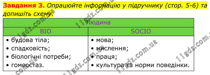 Завдання 3. Опрацюйте інформацію у підручнику (стор. 5-6) та допишіть схему. Людина BIO SOCIO • будова тіла; • спадковість; • біологічні потреби; • гомеостаз. • мова; • мислення; • праця; • культура та норми поведінки.
