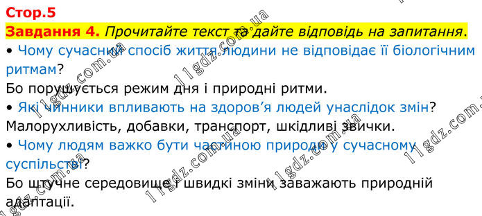 Завдання 4. Прочитайте текст та дайте відповідь на запитання. • Чому сучасний спосіб життя людини не відповідає її біологічним ритмам? Бо порушується режим дня і природні ритми. • Які чинники впливають на здоров’я людей унаслідок змін? Малорухливість, добавки, транспорт, шкідливі звички. • Чому людям важко бути частиною природи у сучасному суспільстві? Бо штучне середовище і швидкі зміни заважають природній адаптації.