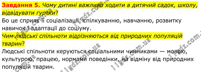 Завдання 5. Чому дитині важливо ходити в дитячий садок, школу, відвідувати гуртки? Бо це сприяє її соціалізації: спілкуванню, навчанню, розвитку навичок і адаптації до соціуму. Чим людські спільноти відрізняються від природних популяцій тварин? Людські спільноти керуються соціальними чинниками — мовою, культурою, працею, нормами поведінки, на відміну від природних популяцій тварин.