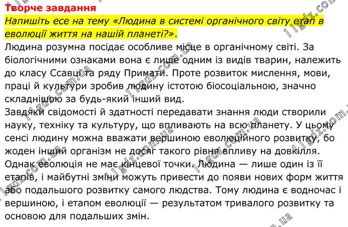 Творче завдання Напишіть есе на тему «Людина в системі органічного світу етап в еволюції життя на нашій планеті?». Людина розумна посідає особливе місце в органічному світі. За біологічними ознаками вона є лише одним із видів тварин, належить до класу Ссавці та ряду Примати. Проте розвиток мислення, мови, праці й культури зробив людину істотою біосоціальною, значно складнішою за будь-який інший вид. Завдяки свідомості й здатності передавати знання люди створили науку, техніку та культуру, що впливають на всю планету. У цьому сенсі людину можна вважати вершиною еволюційного розвитку, бо жоден інший організм не досяг такого рівня впливу на довкілля. Однак еволюція не має кінцевої точки. Людина — лише один із її етапів, і майбутні зміни можуть привести до появи нових форм життя або подальшого розвитку самого людства. Тому людина є водночас і вершиною, і етапом еволюції — результатом тривалого розвитку та основою для подальших змін.