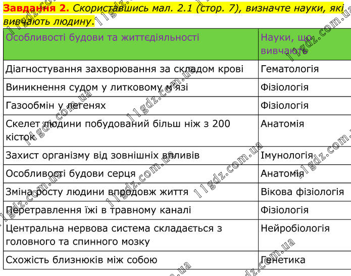 Завдання 2. Скориставшись мал. 2.1 (стор. 7), визначте науки, які вивчають людину. Особливості будови та життєдіяльності Науки, що вивчають Діагностування захворювання за складом крові Гематологія Виникнення судом у литковому м’язі Фізіологія Газообмін у легенях Фізіологія Скелет людини побудований більш ніж з 200 кісток Анатомія Захист організму від зовнішніх впливів Імунологія Особливості будови серця Анатомія Зміна росту людини впродовж життя Вікова фізіологія Перетравлення їжі в травному каналі Фізіологія Центральна нервова система складається з головного та спинного мозку Нейробіологія Схожість близнюків між собою Генетика
