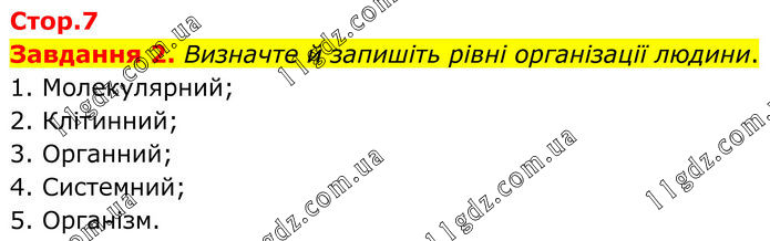 Завдання 2. Визначте й запишіть рівні організації людини. 1. Молекулярний; 2. Клітинний; 3. Органний; 4. Системний; 5. Організм.