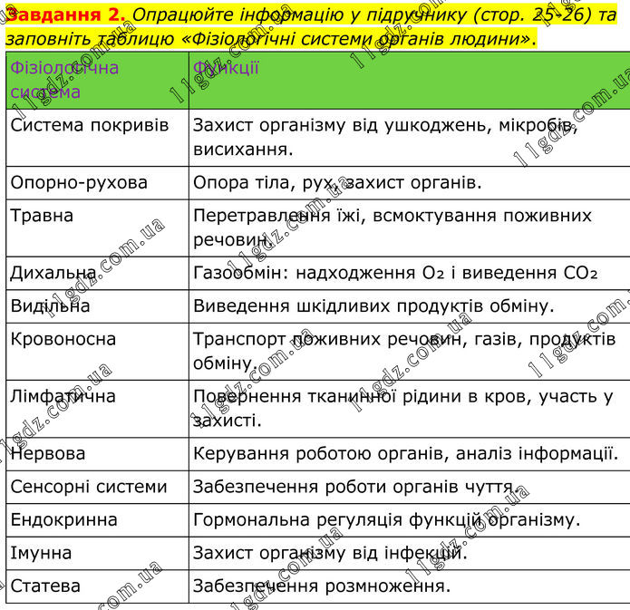 Завдання 2. Опрацюйте інформацію у підручнику (стор. 25-26) та заповніть таблицю «Фізіологічні системи органів людини». Фізіологічна система Функції Система покривів Захист організму від ушкоджень, мікробів, висихання. Опорно-рухова Опора тіла, рух, захист органів. Травна Перетравлення їжі, всмоктування поживних речовин. Дихальна Газообмін: надходження О₂ і виведення CO₂ Видільна Виведення шкідливих продуктів обміну. Кровоносна Транспорт поживних речовин, газів, продуктів обміну. Лімфатична Повернення тканинної рідини в кров, участь у захисті. Нервова Керування роботою органів, аналіз інформації. Сенсорні системи Забезпечення роботи органів чуття. Ендокринна Гормональна регуляція функцій організму. Імунна Захист організму від інфекцій. Статева Забезпечення розмноження.
