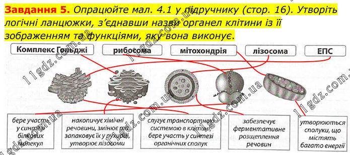 Завдання 5. Опрацюйте мал. 4.1 у підручнику (стор. 16). Утворіть логічні ланцюжки, з’єднавши назви органел клітини із її зображенням та функціями, яку вона виконує.
