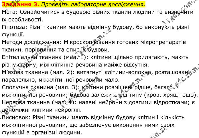 Завдання 3. Проведіть лабораторне дослідження. Мета: Ознайомитися з будовою різних тканин людини та визначити їх особливості. Гіпотеза: Різні тканини мають відмінну будову, бо виконують різні функції. Методи дослідження: Мікроскопіювання готових мікропрепаратів тканин, порівняння та опис їх будови. Епітеліальна тканина (мал. 1): клітини щільно прилягають, мають різну форму, міжклітинна речовина майже відсутня. М’язова тканина (мал. 2): витягнуті клітини-волокна, розташовані паралельно, міжклітинної речовини мало. Сполучна тканина (мал. 3): клітини розміщені рідше, багато міжклітинної речовини; будова залежить від типу (кров, хрящ тощо). Нервова тканина (мал. 4): наявні нейрони з довгими відростками; є допоміжні клітини нейроглії. Висновок: Різні тканини мають відмінну будову клітин і кількість міжклітинної речовини, що забезпечує виконання ними своїх функцій в організмі людини.