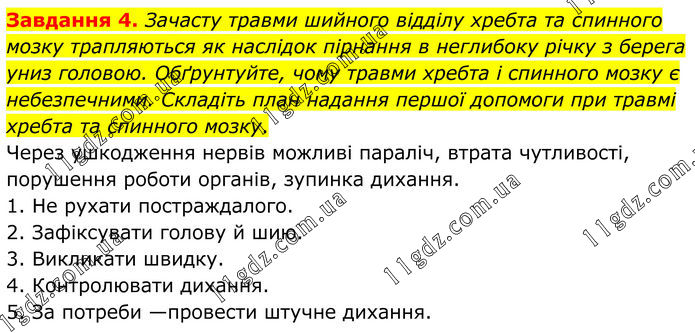 Завдання 4. Зачасту травми шийного відділу хребта та спинного мозку трапляються як наслідок пірнання в неглибоку річку з берега униз головою. Обґрунтуйте, чому травми хребта і спинного мозку є небезпечними. Складіть план надання першої допомоги при травмі хребта та спинного мозку. Через ушкодження нервів можливі параліч, втрата чутливості, порушення роботи органів, зупинка дихання. 1. Не рухати постраждалого. 2. Зафіксувати голову й шию. 3. Викликати швидку. 4. Контролювати дихання. 5. За потреби —провести штучне дихання.