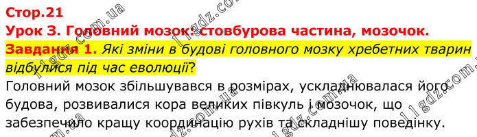 Урок З. Головний мозок: стовбурова частина, мозочок. Завдання 1. Які зміни в будові головного мозку хребетних тварин відбулися під час еволюції? Головний мозок збільшувався в розмірах, ускладнювалася його будова, розвивалися кора великих півкуль і мозочок, що забезпечило кращу координацію рухів та складнішу поведінку.