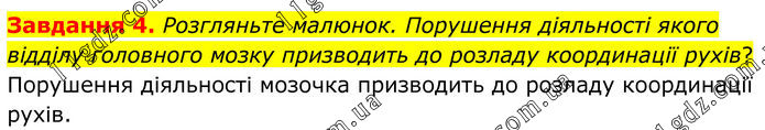 Завдання 4. Розгляньте малюнок. Порушення діяльності якого відділу головного мозку призводить до розладу координації рухів? Порушення діяльності мозочка призводить до розладу координації рухів.
