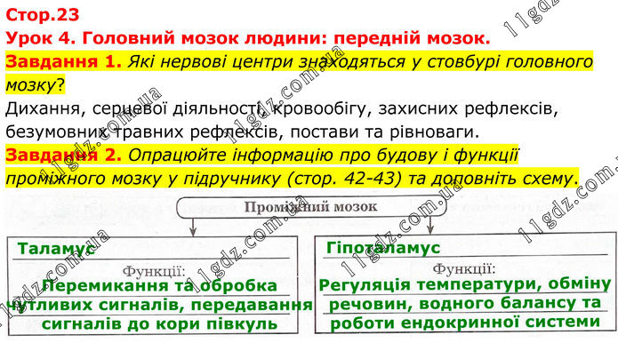 Урок 4. Головний мозок людини: передній мозок. Завдання 1. Які нервові центри знаходяться у стовбурі головного мозку? Дихання, серцевої діяльності, кровообігу, захисних рефлексів, безумовних травних рефлексів, постави та рівноваги. Завдання 2. Опрацюйте інформацію про будову і функції проміжного мозку у підручнику (стор. 42-43) та доповніть схему.