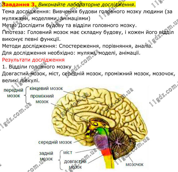 Завдання 3. Виконайте лабораторне дослідження. Тема дослідження: Вивчення будови головного мозку людини (за муляжами, моделями, анімаціями) Мета: Дослідити будову та відділи головного мозку. Гіпотеза: Головний мозок має складну будову, і кожен його відділ виконує певні функції. Методи дослідження: Спостереження, порівняння, аналіз. Для дослідження необхідно: муляжі, моделі, анімації. Результати дослідження 1. Відділи головного мозку Довгастий мозок, міст, середній мозок, проміжний мозок, мозочок, великі півкулі.