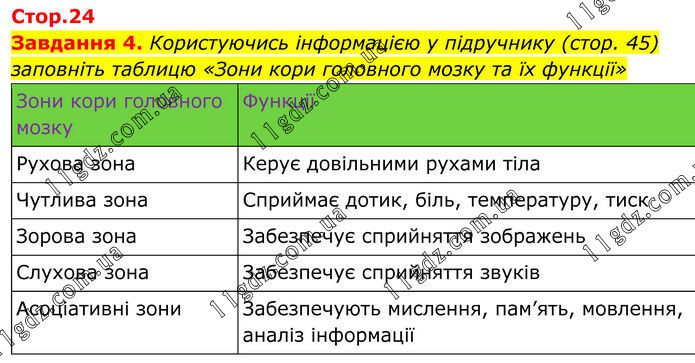 Завдання 4. Користуючись інформацією у підручнику (стор. 45) заповніть таблицю «Зони кори головного мозку та їх функції» Зони кори головного мозку Функції Рухова зона Керує довільними рухами тіла Чутлива зона Сприймає дотик, біль, температуру, тиск Зорова зона Забезпечує сприйняття зображень Слухова зона Забезпечує сприйняття звуків Асоціативні зони Забезпечують мислення, пам’ять, мовлення, аналіз інформації