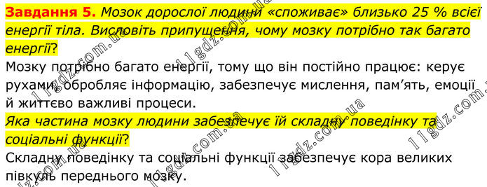 Завдання 5. Мозок дорослої людини «споживає» близько 25 % всієї енергії тіла. Висловіть припущення, чому мозку потрібно так багато енергії? Мозку потрібно багато енергії, тому що він постійно працює: керує рухами, обробляє інформацію, забезпечує мислення, пам’ять, емоції й життєво важливі процеси. Яка частина мозку людини забезпечує їй складну поведінку та соціальні функції? Складну поведінку та соціальні функції забезпечує кора великих півкуль переднього мозку.