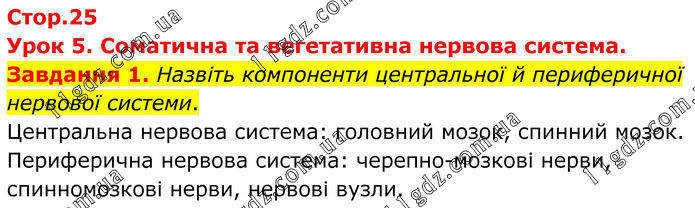 Урок 5. Соматична та вегетативна нервова система. Завдання 1. Назвіть компоненти центральної й периферичної нервової системи. Центральна нервова система: головний мозок, спинний мозок. Периферична нервова система: черепно-мозкові нерви, спинномозкові нерви, нервові вузли.