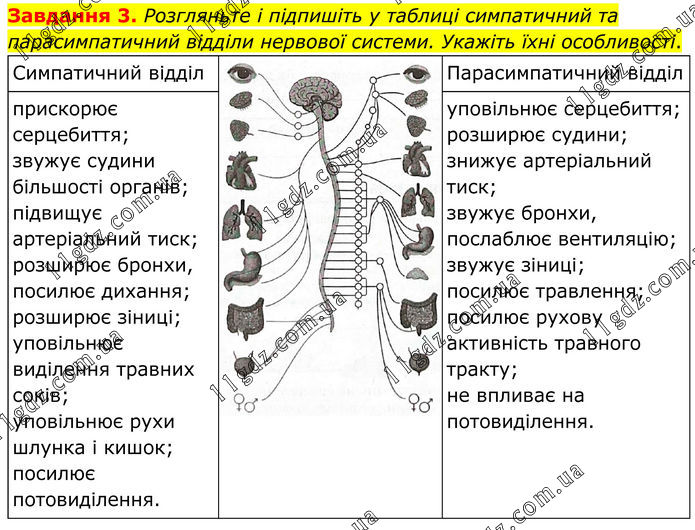 Завдання 3. Розгляньте і підпишіть у таблиці симпатичний та парасимпатичний відділи нервової системи. Укажіть їхні особливості. Симпатичний відділ Парасимпатичний відділ прискорює серцебиття; звужує судини більшості органів; підвищує артеріальний тиск; розширює бронхи, посилює дихання; розширює зіниці; уповільнює виділення травних соків; уповільнює рухи шлунка і кишок; посилює потовиділення. уповільнює серцебиття; розширює судини; знижує артеріальний тиск; звужує бронхи, послаблює вентиляцію; звужує зіниці; посилює травлення; посилює рухову активність травного тракту; не впливає на потовиділення.