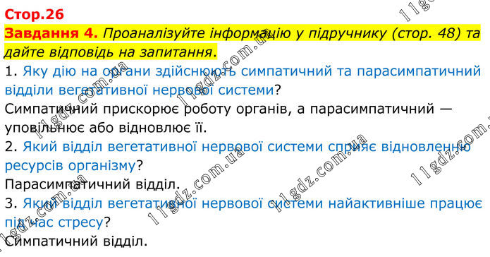 Завдання 4. Проаналізуйте інформацію у підручнику (стор. 48) та дайте відповідь на запитання. 1. Яку дію на органи здійснюють симпатичний та парасимпатичний відділи вегетативної нервової системи? Симпатичний прискорює роботу органів, а парасимпатичний — уповільнює або відновлює її. 2. Який відділ вегетативної нервової системи сприяє відновленню ресурсів організму? Парасимпатичний відділ. 3. Який відділ вегетативної нервової системи найактивніше працює під час стресу? Симпатичний відділ.