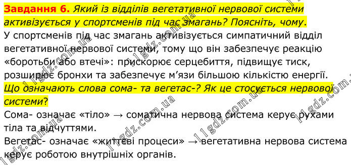 Завдання 6. Який із відділів вегетативної нервової системи активізується у спортсменів під час змагань? Поясніть, чому. У спортсменів під час змагань активізується симпатичний відділ вегетативної нервової системи, тому що він забезпечує реакцію «боротьби або втечі»: прискорює серцебиття, підвищує тиск, розширює бронхи та забезпечує м’язи більшою кількістю енергії. Що означають слова сома- та вегетас-? Як це стосується нервової системи? Сома- означає «тіло» → соматична нервова система керує рухами тіла та відчуттями. Вегетас- означає «життєві процеси» → вегетативна нервова система керує роботою внутрішніх органів.