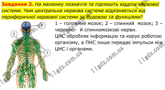Завдання 3. На малюнку позначте та підпишіть відділи нервової системи. Чим центральна нервова система відрізняється від периферичної нервової системи за будовою та функціями? 1 – головний мозок; 2 – спинний мозок; 3 – черепно- й спинномозкові нерви. ЦНС обробляє інформацію та керує роботою організму, а ПНС лише передає імпульси між ЦНС і органами.