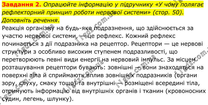 Завдання 2. Опрацюйте інформацію у підручнику «У чому полягає рефлекторний принцип роботи нервової системи» (стор. 50). Доповніть речення. Реакція організму на будь-яке подразнення, що здійснюється за участю нервової системи, — це рефлекс. Кожний рефлекс починається з дії подразника на рецептор. Рецептори — це нервові структури з особливо високим ступенем подразливості, що перетворюють певні види енергії на нервовий імпульс. За місцем розташування рецептори бувають: зовнішні — вони знаходяться на поверхні тіла й сприймають вплив зовнішніх подразників (органи зору, слуху, смаку тощо) та внутрішні — розміщені всередині тіла, отримують інформацію від внутрішніх органів і тканин (кровоносних судин, легень, шлунку).