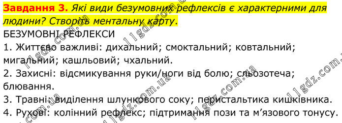 Завдання 3. Які види безумовних рефлексів є характерними для людини? Створіть ментальну карту. БЕЗУМОВНІ РЕФЛЕКСИ 1. Життєво важливі: дихальний; смоктальний; ковтальний; мигальний; кашльовий; чхальний. 2. Захисні: відсмикування руки/ноги від болю; сльозотеча; блювання. 3. Травні: виділення шлункового соку; перистальтика кишківника. 4. Рухові: колінний рефлекс; підтримання пози та м’язового тонусу.