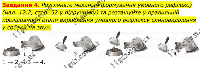 Завдання 4. Розгляньте механізм формування умовного рефлексу (мал. 12.2, стор. 52 у підручнику) та розташуйте у правильній послідовності етапи вироблення умовного рефлексу слиновиділення у собаки на звук. 1 → 2 → 3 → 4.