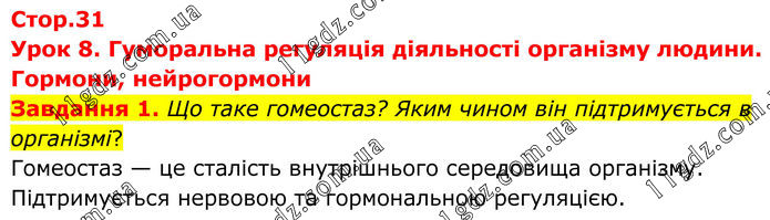 Урок 8. Гуморальна регуляція діяльності організму людини. Гормони, нейрогормони Завдання 1. Що таке гомеостаз? Яким чином він підтримується в організмі? Гомеостаз — це сталість внутрішнього середовища організму. Підтримується нервовою та гормональною регуляцією.