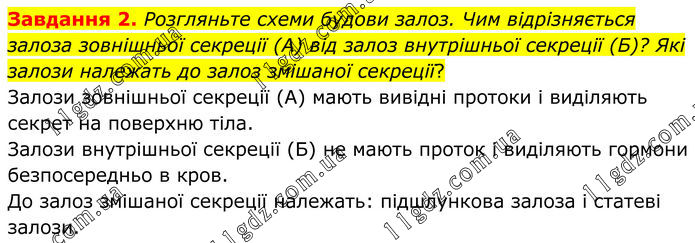 Завдання 2. Розгляньте схеми будови залоз. Чим відрізняється залоза зовнішньої секреції (А) від залоз внутрішньої секреції (Б)? Які залози належать до залоз змішаної секреції? Залози зовнішньої секреції (А) мають вивідні протоки і виділяють секрет на поверхню тіла. Залози внутрішньої секреції (Б) не мають проток і виділяють гормони безпосередньо в кров. До залоз змішаної секреції належать: підшлункова залоза і статеві залози.