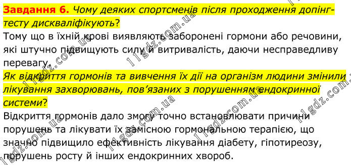 Завдання 6. Чому деяких спортсменів після проходження допінг-тесту дискваліфікують? Тому що в їхній крові виявляють заборонені гормони або речовини, які штучно підвищують силу й витривалість, даючи несправедливу перевагу. Як відкриття гормонів та вивчення їх дії на організм людини змінили лікування захворювань, пов’язаних з порушенням ендокринної системи? Відкриття гормонів дало змогу точно встановлювати причини порушень та лікувати їх замісною гормональною терапією, що значно підвищило ефективність лікування діабету, гіпотиреозу, порушень росту й інших ендокринних хвороб.