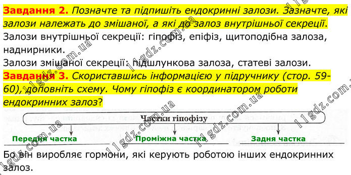 Завдання 2. Позначте та підпишіть ендокринні залози. Зазначте, які залози належать до змішаної, а які до залоз внутрішньої секреції. Залози внутрішньої секреції: гіпофіз, епіфіз, щитоподібна залоза, наднирники. Залози змішаної секреції: підшлункова залоза, статеві залози. Завдання 3. Скориставшись інформацією у підручнику (стор. 59-60), доповніть схему. Чому гіпофіз є координатором роботи ендокринних залоз? Бо він виробляє гормони, які керують роботою інших ендокринних залоз.
