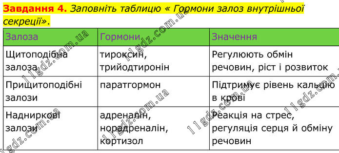 Завдання 4. Заповніть таблицю « Гормони залоз внутрішньої секреції». Залоза Гормони Значення Щитоподібна залоза тироксин, трийодтиронін Регулюють обмін речовин, ріст і розвиток Прищитоподібні залози паратгормон Підтримує рівень кальцію в крові Надниркові залози адреналін, норадреналін, кортизол Реакція на стрес, регуляція серця й обміну речовин