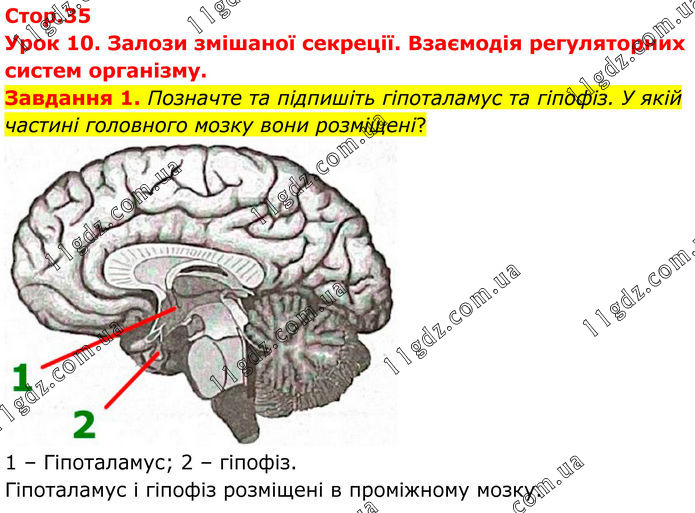 Урок 10. Залози змішаної секреції. Взаємодія регуляторних систем організму. Завдання 1. Позначте та підпишіть гіпоталамус та гіпофіз. У якій частині головного мозку вони розміщені? 1 – Гіпоталамус; 2 – гіпофіз. Гіпоталамус і гіпофіз розміщені в проміжному мозку.