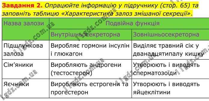 Завдання 2. Опрацюйте інформацію у підручнику (стор. 65) та заповніть таблицю «Характеристика залоз змішаної секреції». Назва залози Подвійна функція Внутрішньосекреторна Зовнішньосекреторна Підшлункова залоза Виробляє гормони інсулін і глюкагон Виділяє травний сік у дванадцятипалу кишку Сім’яники Виробляють андрогени (тестостерон) Утворюють і виводять сперматозоїди Яєчники Виробляють естрогени та прогестерон Утворюють і виводять яйцеклітини