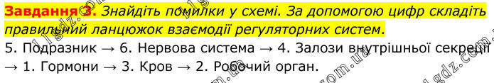 Завдання 3. Знайдіть помилки у схемі. За допомогою цифр складіть правильний ланцюжок взаємодії регуляторних систем. 5. Подразник → 6. Нервова система → 4. Залози внутрішньої секреції → 1. Гормони → 3. Кров → 2. Робочий орган.
