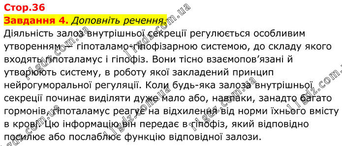 Стор.36 Завдання 4. Доповніть речення. Діяльність залоз внутрішньої секреції регулюється особливим утворенням — гіпоталамо-гіпофізарною системою, до складу якого входять гіпоталамус і гіпофіз. Вони тісно взаємопов’язані й утворюють систему, в роботу якої закладений принцип нейрогуморальної регуляції. Коли будь-яка залоза внутрішньої секреції починає виділяти дуже мало або, навпаки, занадто багато гормонів, гіпоталамус реагує на відхилення від норми їхнього вмісту в крові. Цю інформацію він передає в гіпофіз, який відповідно посилює або послаблює функцію відповідної залози.