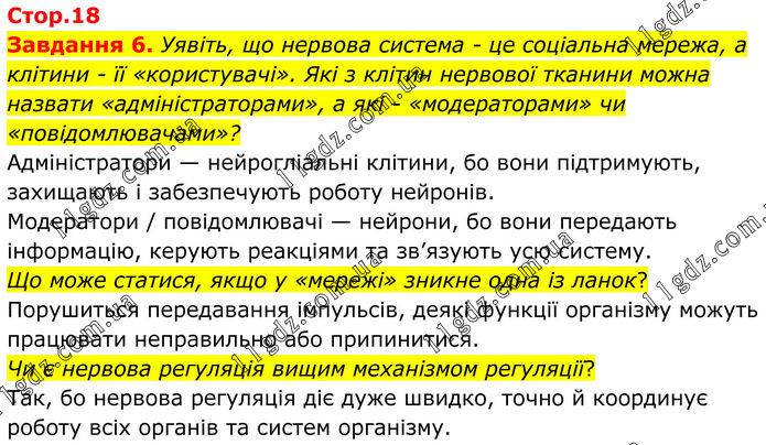 Завдання 6. Уявіть, що нервова система - це соціальна мережа, а клітини - її «користувачі». Які з клітин нервової тканини можна назвати «адміністраторами», а які - «модераторами» чи «повідомлювачами»? Адміністратори — нейрогліальні клітини, бо вони підтримують, захищають і забезпечують роботу нейронів. Модератори / повідомлювачі — нейрони, бо вони передають інформацію, керують реакціями та зв’язують усю систему. Що може статися, якщо у «мережі» зникне одна із ланок? Порушиться передавання імпульсів, деякі функції організму можуть працювати неправильно або припинитися. Чи є нервова регуляція вищим механізмом регуляції? Так, бо нервова регуляція діє дуже швидко, точно й координує роботу всіх органів та систем організму.