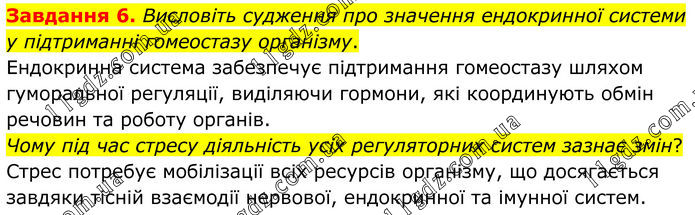 Завдання 6. Висловіть судження про значення ендокринної системи у підтриманні гомеостазу організму. Ендокринна система забезпечує підтримання гомеостазу шляхом гуморальної регуляції, виділяючи гормони, які координують обмін речовин та роботу органів. Чому під час стресу діяльність усіх регуляторних систем зазнає змін? Стрес потребує мобілізації всіх ресурсів організму, що досягається завдяки тісній взаємодії нервової, ендокринної та імунної систем.