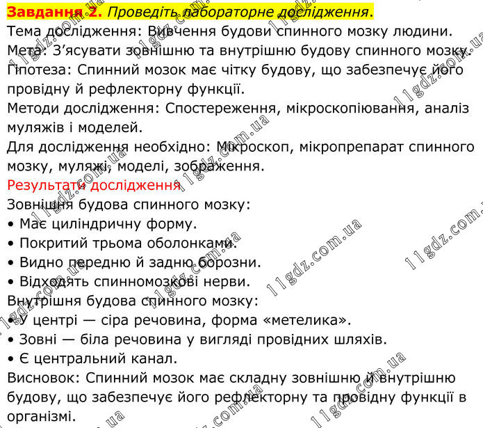 Завдання 2. Проведіть лабораторне дослідження. Тема дослідження: Вивчення будови спинного мозку людини. Мета: З’ясувати зовнішню та внутрішню будову спинного мозку. Гіпотеза: Спинний мозок має чітку будову, що забезпечує його провідну й рефлекторну функції. Методи дослідження: Спостереження, мікроскопіювання, аналіз муляжів і моделей. Для дослідження необхідно: Мікроскоп, мікропрепарат спинного мозку, муляжі, моделі, зображення. Результати дослідження Зовнішня будова спинного мозку: • Має циліндричну форму. • Покритий трьома оболонками. • Видно передню й задню борозни. • Відходять спинномозкові нерви. Внутрішня будова спинного мозку: • У центрі — сіра речовина, форма «метелика». • Зовні — біла речовина у вигляді провідних шляхів. • Є центральний канал. Висновок: Спинний мозок має складну зовнішню й внутрішню будову, що забезпечує його рефлекторну та провідну функції в організмі.