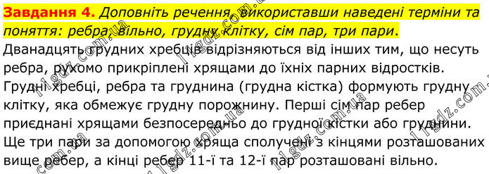 Завдання 4. Доповніть речення, використавши наведені терміни та поняття: ребра, вільно, грудну клітку, сім пар, три пари. Дванадцять грудних хребців відрізняються від інших тим, що несуть ребра, рухомо прикріплені хрящами до їхніх парних відростків. Грудні хребці, ребра та груднина (грудна кістка) формують грудну клітку, яка обмежує грудну порожнину. Перші сім пар ребер приєднані хрящами безпосередньо до грудної кістки або груднини. Ще три пари за допомогою хряща сполучені з кінцями розташованих вище ребер, а кінці ребер 11-ї та 12-ї пар розташовані вільно.