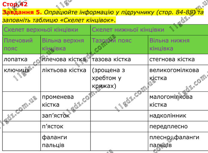 Завдання 5. Опрацюйте інформацію у підручнику (стор. 84-85) та заповніть таблицю «Скелет кінцівок». Скелет верхньої кінцівки Скелет нижньої кінцівки Плечовий пояс Вільна верхня кінцівка Тазовий пояс Вільна нижня кінцівка лопатка плечова кістка тазова кістка стегнова кістка ключиця ліктьова кістка (зрощена з хребтом у крижах) великогомілкова кістка променева кістка малогомілкова кістка зап’ясток надколінник п’ясток передплесно фаланги пальців плесно, фаланги пальців