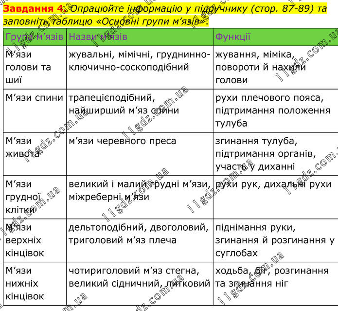Завдання 4. Опрацюйте інформацію у підручнику (стор. 87-89) та заповніть таблицю «Основні групи м’язів». Група м’язів Назви м’язів Функції М’язи голови та шиї жувальні, мімічні, груднинно-ключично-соскоподібний жування, міміка, повороти й нахили голови М’язи спини трапецієподібний, найширший м’яз спини рухи плечового пояса, підтримання положення тулуба М’язи живота м’язи черевного преса згинання тулуба, підтримання органів, участь у диханні М’язи грудної клітки великий і малий грудні м’язи, міжреберні м’язи рухи рук, дихальні рухи М’язи верхніх кінцівок дельтоподібний, двоголовий, триголовий м’яз плеча піднімання руки, згинання й розгинання у суглобах М’язи нижніх кінцівок чотириголовий м’яз стегна, великий сідничний, литковий ходьба, біг, розгинання та згинання ніг