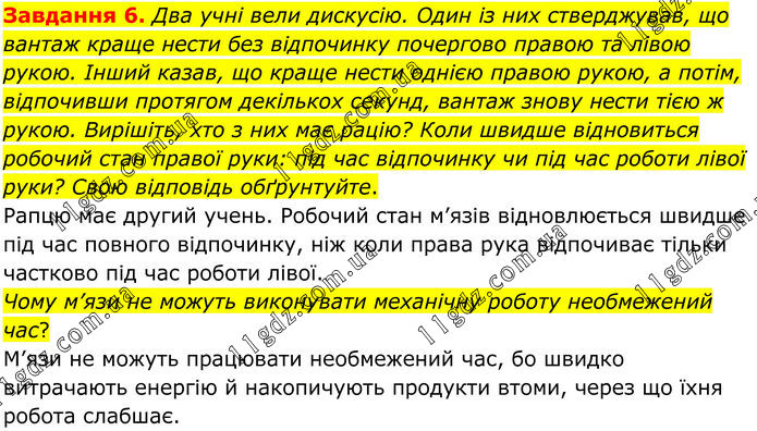 Завдання 6. Два учні вели дискусію. Один із них стверджував, що вантаж краще нести без відпочинку почергово правою та лівою рукою. Інший казав, що краще нести однією правою рукою, а потім, відпочивши протягом декількох секунд, вантаж знову нести тією ж рукою. Вирішіть, хто з них має рацію? Коли швидше відновиться робочий стан правої руки: під час відпочинку чи під час роботи лівої руки? Свою відповідь обґрунтуйте. Рапцю має другий учень. Робочий стан м’язів відновлюється швидше під час повного відпочинку, ніж коли права рука відпочиває тільки частково під час роботи лівої. Чому м’язи не можуть виконувати механічну роботу необмежений час? М’язи не можуть працювати необмежений час, бо швидко витрачають енергію й накопичують продукти втоми, через що їхня робота слабшає.
