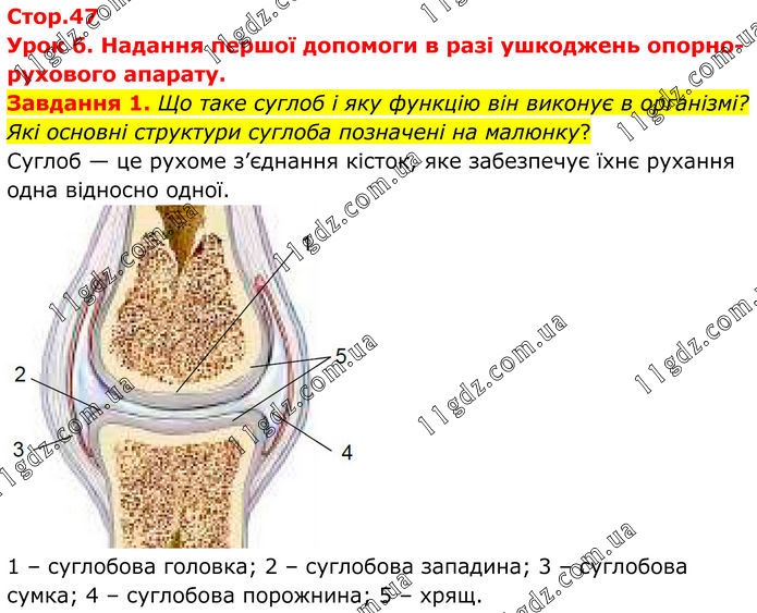 Стор.47 Урок б. Надання першої допомоги в разі ушкоджень опорно-рухового апарату. Завдання 1. Що таке суглоб і яку функцію він виконує в організмі? Які основні структури суглоба позначені на малюнку? Суглоб — це рухоме з’єднання кісток, яке забезпечує їхнє рухання одна відносно одної. 1 – суглобова головка; 2 – суглобова западина; 3 – суглобова сумка; 4 – суглобова порожнина; 5 – хрящ.