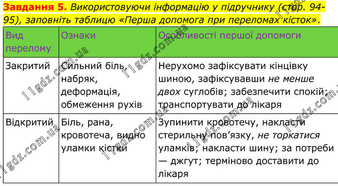 Завдання 5. Використовуючи інформацію у підручнику (стор. 94-95), заповніть таблицю «Перша допомога при переломах кісток». Вид перелому Ознаки Особливості першої допомоги Закритий Сильний біль, набряк, деформація, обмеження рухів Нерухомо зафіксувати кінцівку шиною, зафіксувавши не менше двох суглобів; забезпечити спокій; транспортувати до лікаря Відкритий Біль, рана, кровотеча, видно уламки кістки Зупинити кровотечу, накласти стерильну пов’язку, не торкатися уламків; накласти шину; за потреби — джгут; терміново доставити до лікаря