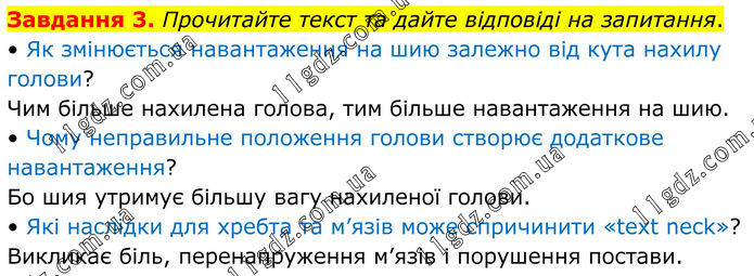 Завдання 3. Прочитайте текст та дайте відповіді на запитання. • Як змінюється навантаження на шию залежно від кута нахилу голови? Чим більше нахилена голова, тим більше навантаження на шию. • Чому неправильне положення голови створює додаткове навантаження? Бо шия утримує більшу вагу нахиленої голови. • Які наслідки для хребта та м’язів може спричинити «text neck»? Викликає біль, перенапруження м’язів і порушення постави.
